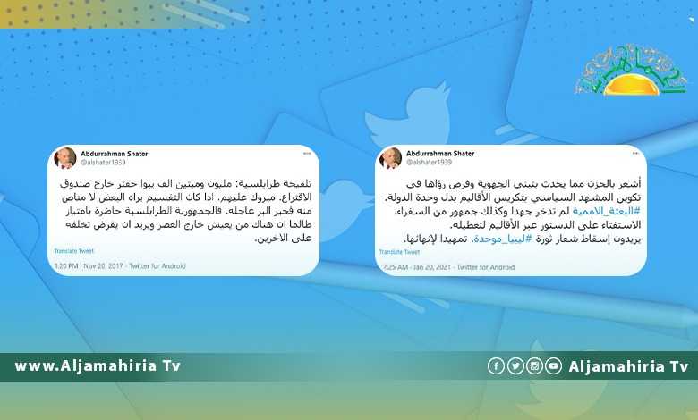 يريدون إسقاط شعار ثورة #ليبيا_موحدة. تمهيدا لإنهائها.— Abdurrahman Shater (@alshater1939) January 19, 2021