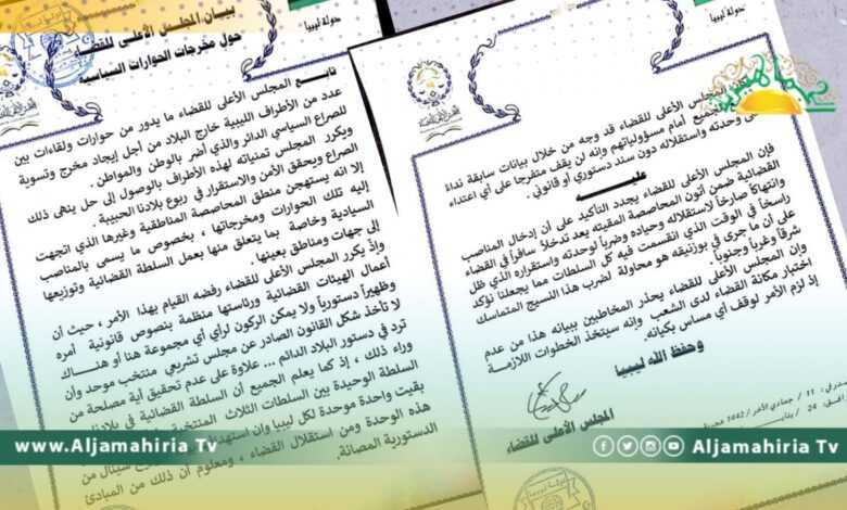 وشدد “الأعلى للقضاء”، أنه لا يمكن الركون لرأى مجموعة لا تأخذ شكل القانون الصادر عن مجلس تشريعى منتخب موحد. علاوة على عدم تحقيق أي مصلحة من وراء ذلك. لافتا إلى أن السلطة القضائية في ليبيا هي الوحيدة المنتخبة وفقا للقانون، وهى موحدة لكل الليبيين وأن استهدافها بهذا التوزيع سينال من هذه الوحدة على حد قول البيان.