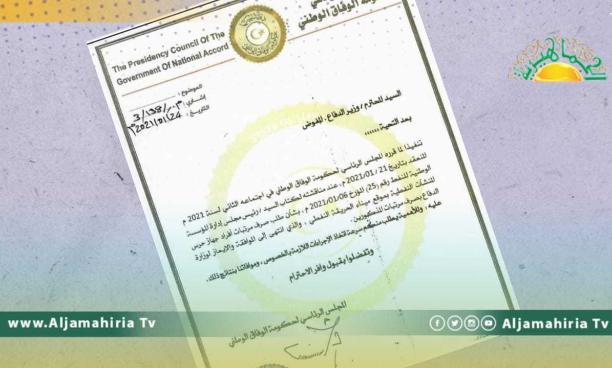 قرر المجلس الرئاسي التابع لحكومة السراج، اليوم الأحد صرف مرتبات أفراد جهاز حرس المنشآت النفطية بموقع ميناء الحريقة.