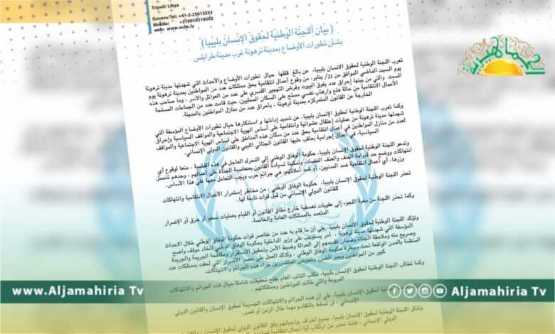 وأعربت اللجنة عن شديد إدانتها و استنكارها حيال تطورات الأوضاع المؤسفة التي شهدتها مدينة ترهونة من عمليات إعتقال عشوائية وانتقامية على أساس الهوية الاجتماعية والمواقف السياسية وإحراق لعدد من منازل المواطنين في أعمال انتقامية بحق عدد من سكان هذه المناطق على أساس الهوية الاجتماعية والمواقف السياسية ، في أعمال إجرامية يعاقب عليها القانون الجنائي الليبي والقانون الدولى الإنساني.