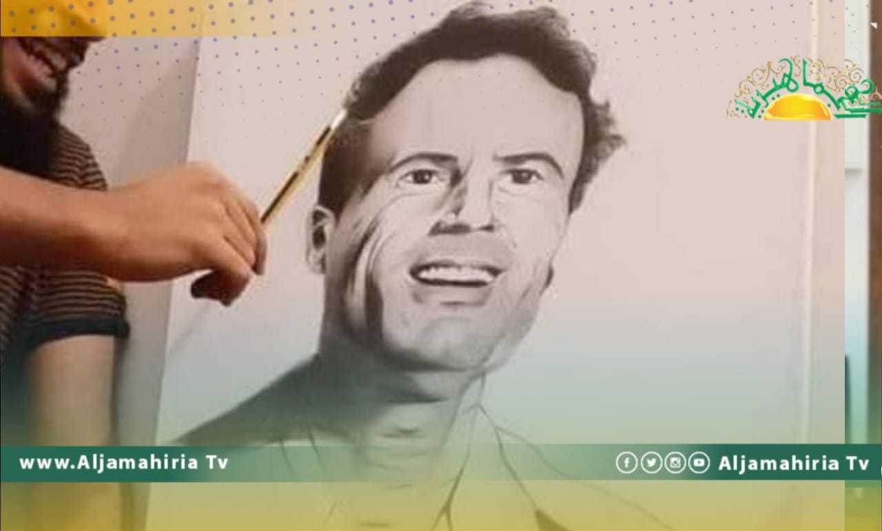 لوحة فنية جسد فيها الرسام الشاب أسكندر العبار في مدينة بنغازي صورة القائد الشهيد معمر القذافي تحقق نسبة مشاهدة عالية.