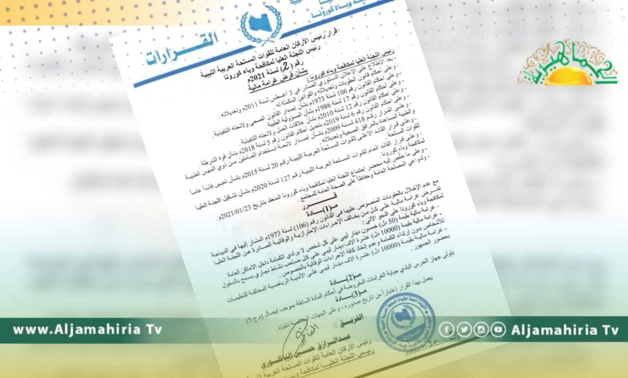 وتضمن القرار فرض 50 دينار ليبي كغرامة على كل شخص لا يرتدي الكمامة في الأماكن العامة، وفرض عشرة آلاف دينار ليبي غرامة على كل صاحب نشاط تجاري يسمح للأشخاص بالدخول لمقر نشاطه دون ارتداء الكمامة، كما تضمن فرض عشرة آلاف دينار غرامة على الأندية الرياضية التي تسمح لجمهورها بحضور الأنشطة.