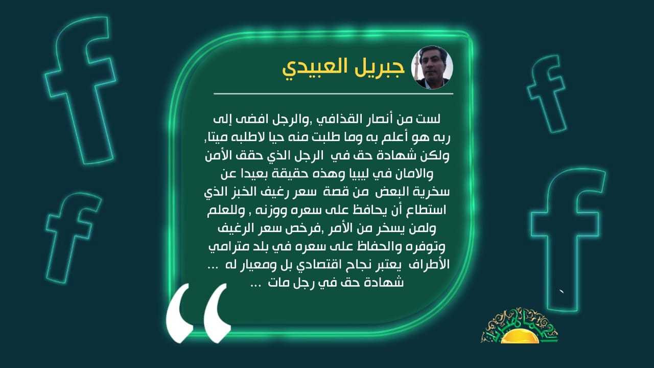 وقال العبيدي لست من أنصار القذافي ,والرجل افضى إلى ربه هو أعلم به وما طلبت منه حيا لاطلبه ميتا, ولكن شهادة حق في الرجل الذي حقق الأمن والامان في ليبيا وهذه حقيقة بعيدا عن سخرية البعض من قصة سعر رغيف الخبز الذي استطاع أن يحافظ على سعره ووزنه , وللعلم ولمن يسخر من الأمر ,فرخص سعر الرغيف وتوفره والحفاظ على سعره في بلد مترامي الأطراف يعتبر نجاح اقتصادي بل ومعيار له … شهادة حق في رجل مات