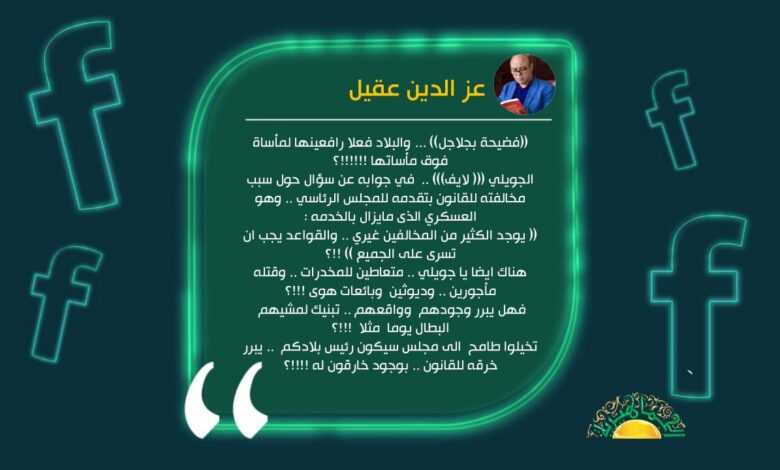 وقال عقيل في تدوينة له على صفحته على فيسبوك، ((فضيحة بجلاجل)) … والبلاد فعلا رافعينها لمأساة فوق مأساتها !!!!!!؟