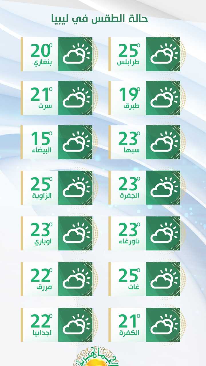 توقع مركز الأرصاد الجوية، في نشرة جوية عن حالة الطقس في ليبيا لمدة ثلاثة أيام، طقساً يميل للاستقرار هذا اليوم على اغلب مناطق ليبيا ودرجات الحرارة القصوى المتوقع تسجيلها هذا اليوم تتراوح ما بين 19 – 25 مْ ولا تتجاوز 17مْ على مناطق الجبل الاخضر مع احتمال ظهور ضباب هذه الليلة وصباح الغد على مناطق الشمال الشرقي.