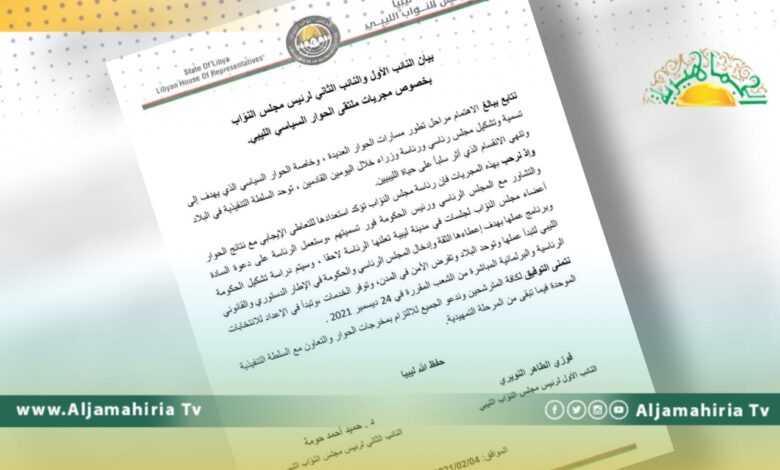 وأكد النائبين الأول والثاني لمجلس نواب طبرق فوزي النويري وحميد حومة في بيان لهما أن الرئاسة ستعمل على دعوة أعضاء “مجلس النواب لجلسات في مدن ليبية تعلنها الرئاسة لاحقا وسيتم دراسة تشكيل الحكومة وبرنامج عملها بهدف إعطائها الثقة وإدخال المجلس الرئاسي والحكومة في الإطار الدستوري والقانوني الليبي لتبدأ عملها وتوحد البلاد وتفرض الأمن في المدن وتوفر الخدمات وتبدأ في الإعداد للانتخابات الرئاسية والبرلمانية المباشرة من الشعب المقررة في 24 ديسمبر 2021.”