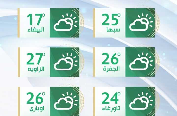 ووفقا للنشرة فإن درجات الحرارة القصوى المتوقع تسجيلها هذا اليوم تتراوح ما بين 21 -26مْ ولا تتجاوز 17 مْ على مناطق الجبل الاخضر، مع احتمال ظهور ضباب هذا الليلة وصباح الغد على طبرق واقصى الساحل الشرقي.، والله اعلم.
