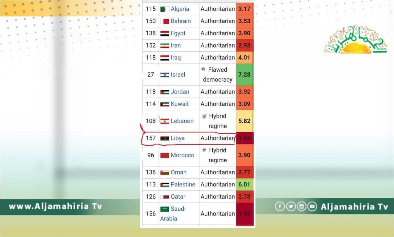 حلت ليبيا في ذيل القائمة، وفق تسمية أنظمة سلطوية مستبدة، والتي صنفت الدول حسب مساحات الديمقراطية وممارستها وتمتع مواطنيها بحقوقهم السياسية والاقتصادية والاجتماعية.
