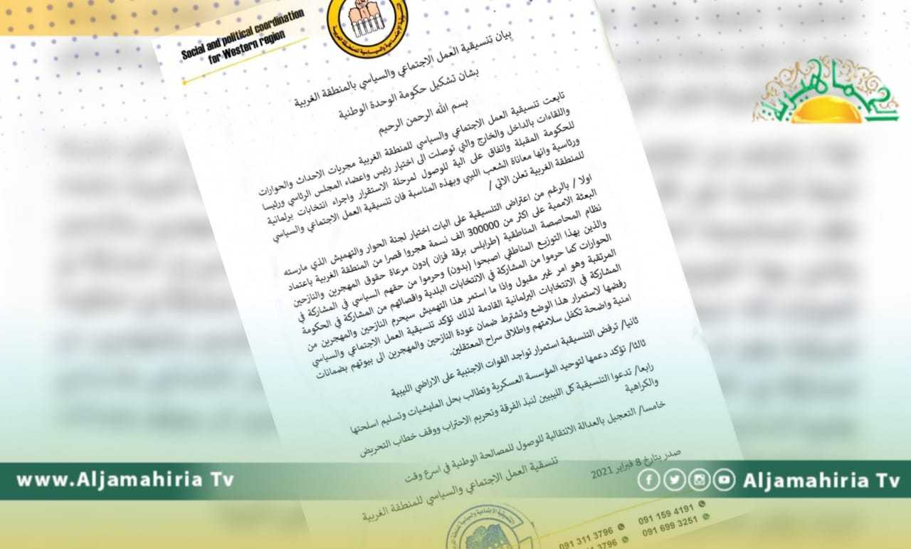 أكدت تنسيقية العمل الاجتماعي والسياسي للمنطقة الغربية رفضها استمرار تواجد القوات الأجنبية على الأراضي الليبية.