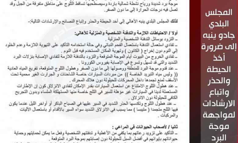 نبه المجلس البلدي جادو، أهالي البلدية إلى ضرورة أخذ الحيطة والحذر واتباع الارشادات لمواجهة موجة البرد الشديدة والرياح التي قد يصحبها تساقط الثلوج على مناطق متفرقة من الجبل، المتوقعة والتي قد تصل درجات الحرارة فيها إلى ما تحت الصفر.