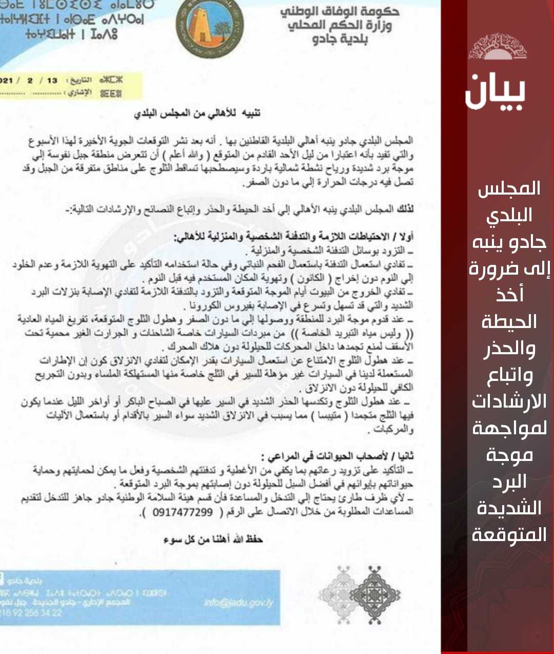 نبه المجلس البلدي جادو، أهالي البلدية إلى ضرورة أخذ الحيطة والحذر واتباع الارشادات لمواجهة موجة البرد الشديدة والرياح التي قد يصحبها تساقط الثلوج على مناطق متفرقة من الجبل، المتوقعة والتي قد تصل درجات الحرارة فيها إلى ما تحت الصفر.