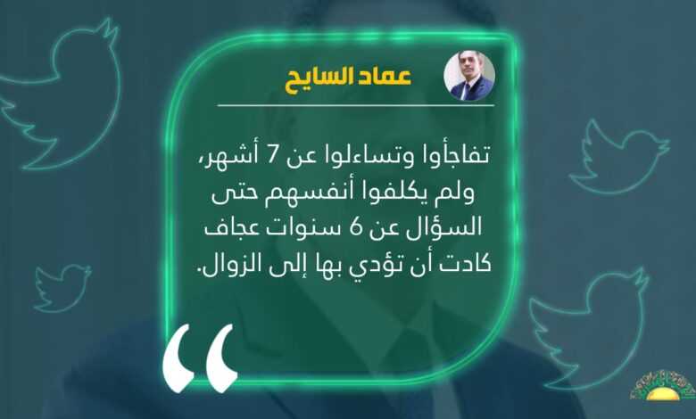 واستغرب في تغريدة له، على صفحته بشبكة التواصل الاجتماعي تويتر بقوله: تفاجأوا وتساءلوا عن 7 اشهر، ولم يكلفوا انفسهم حتى السؤال عن 6 سنوات عجاف كادت أن تؤدي بها إلى الزوال – قاصدا المفوضية.