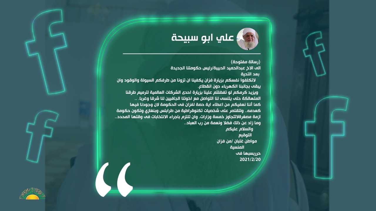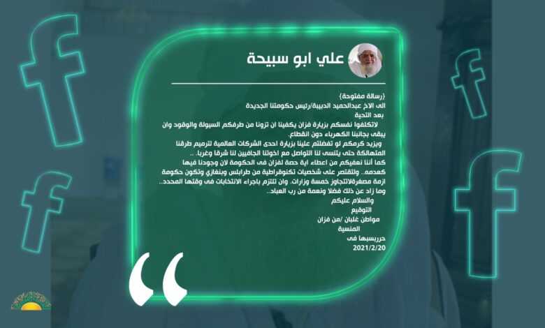 طالب رئيس مجلس أعيان الجنوب علي أبو سبيحة، في رسالة مفتوحة، رئيس الحكومة الانتقالية عبد الحميد الدبيبة، بتوفير السيولة والوقود والكهرباء دون انقطاع.