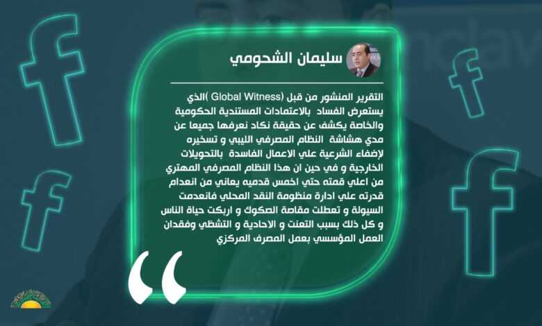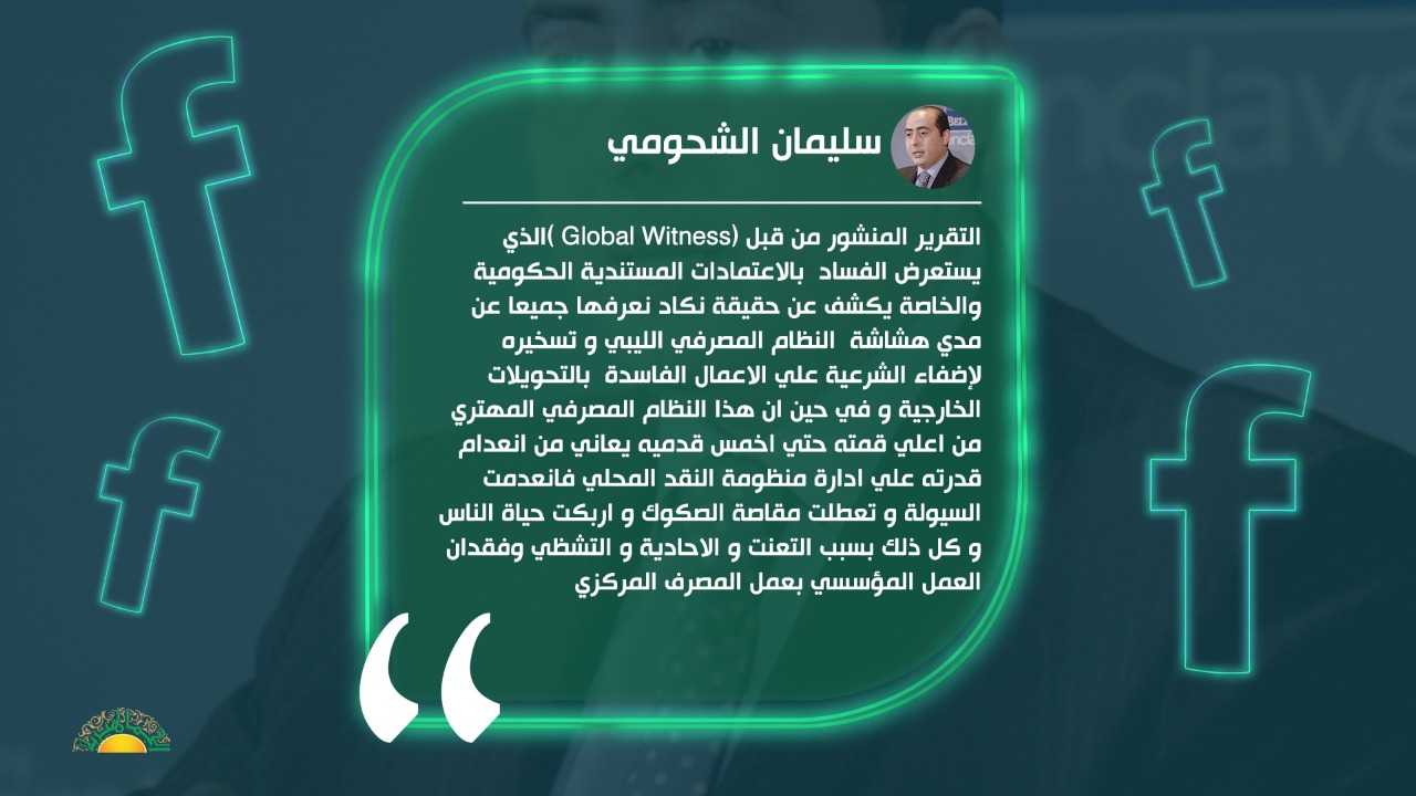 وقال الشحومي في تدوينة له على فيسبوك: التقرير المنشور من قبل (Global Witness )الذي يستعرض الفساد  بالاعتمادات المستندية الحكومية والخاصة والذي إدارة المصرف المركزي عبر آليات اسعار صرف متعددة وتسبب في تحويل النقد الاجنبي عبر الاعتمادات إلى السلعة الاكثر رواجا و طلبا من غيرها ، يكشف ذلك عن حقيقة نكاد نعرفها جميعا عن مدي هشاشة  النظام المصرفي الليبي و تسخيره لإضفاء الشرعية علي الاعمال الفاسدة  بالتحويلات الخارجية و في حين ان هذا النظام المصرفي المهتري من اعلي قمته حتي اخمس قدميه يعاني من انعدام قدرته علي ادارة منظومة النقد المحلي فانعدمت السيولة و تعطلت مقاصة الصكوك و اربكت حياة الناس و كل ذلك بسبب التعنت و الاحادية و التشظي وفقدان العمل المؤسسي بعمل المصرف المركزي ، هذا التقرير سبقه تقرير ديوان المحاسبة  منذ فترة طويلة و الذي اماط اللثام علي  كوارث حقيقية صاحبت عمليات الاعتمادات  و اقام الدينا و لم يقعدها وتم تجاوزه و الاستمرار في نفس المنهج بسبب ثبات سياسة التعامل مع سعر الصرف و استمرار فتح ابواب يجب ان تكون مؤصدة .