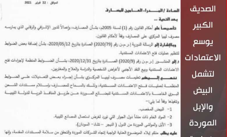وسمح وفق منشور عممه مدير ادارة الرقابة على المصارف والنقد للمصارف باستلام مستندات الشحن البري الخاصة بالاعتمادات المستندية للبضائع الموردة عن طريق المنافذ البرية وتنفيذها فيما يتعلق بالبيض المخصب والمواد الخام ذات المنشأ من دول الجوار التي تورد لغرض استعمال المصانع الليبية اضافة الى الابل والمواشي الموردة من النيجر وتشاد والسودان.
