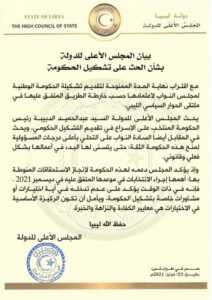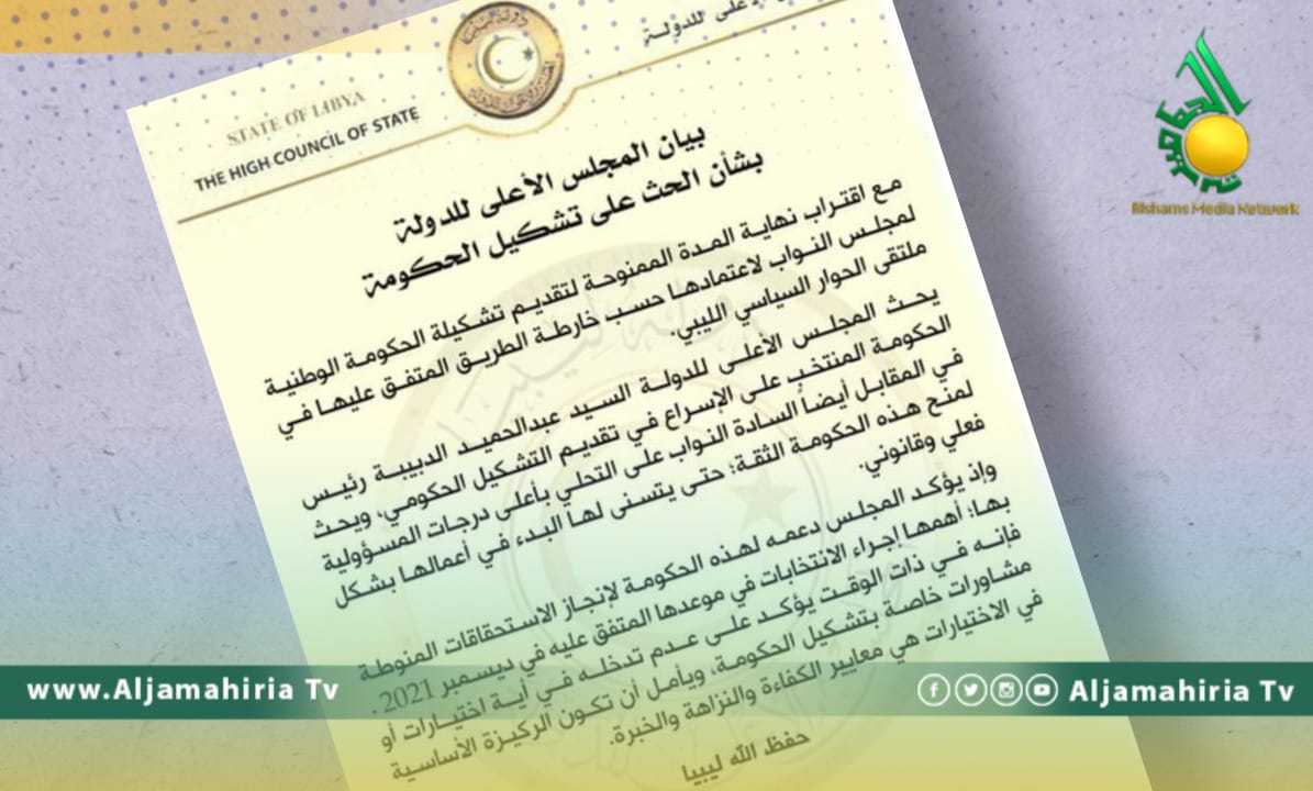 وبحسب المكتب الإعلامي للمجلس، أشار البيان إلى اقتراب نهاية المهلة الممنوحة لرئيس الحكومة الجديدة لتقديم التشكيل الحكومي إلى مجلس النواب لاعتمادها، وفق خارطة الطريق المتفق عليها في ملتقى الحوار السياسي، مؤكدا دعم المجلس لهذه الحكومة لانجاز الاستحقاقات المنوطة بها، وعلى رأسها إجراء الانتخابات.