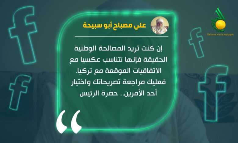 انتقد رئيس المجلس الأعلى لقبائل ومدن فزان، الشيخ علي مصباح أبو سبيحة، تصريحات رئيس الحكومة الانتقالية، عبد الحميد الدبيبة، بشأن تركيا وأهمية الشراكة معها. قائلا: إن كنت تريد المصالحة الوطنية الحقيقة فإنها تتناسب عكسيا مع الاتفاقيات الموقعة مع تركيا.