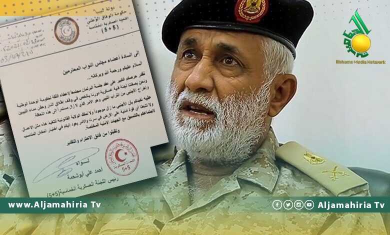 تداولت وسائل إعلام رسالة من اللواء احمد أبوشحمة رئيس المجوعة التابعة لحكومة لوفاق غير الشرعية في لجنة 5+5 تفيد بعدم إختصاصهم قانونيًا وأمنيًا فيما يتعلق بتأمين مجلس النواب اذا ماقرر عقد جلسته بسرت .