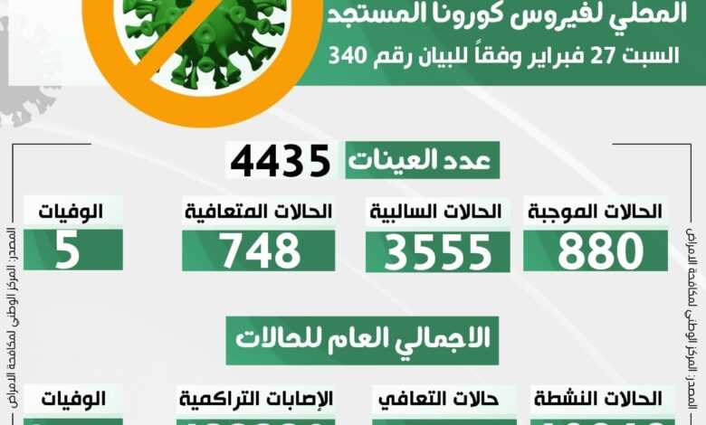 التحديث اليومي للوضع الوبائي المحلي لفيروس كورونا المستجد ليوم السبت 27 فبراير 2021 م وفقا للبيان رقم (340)