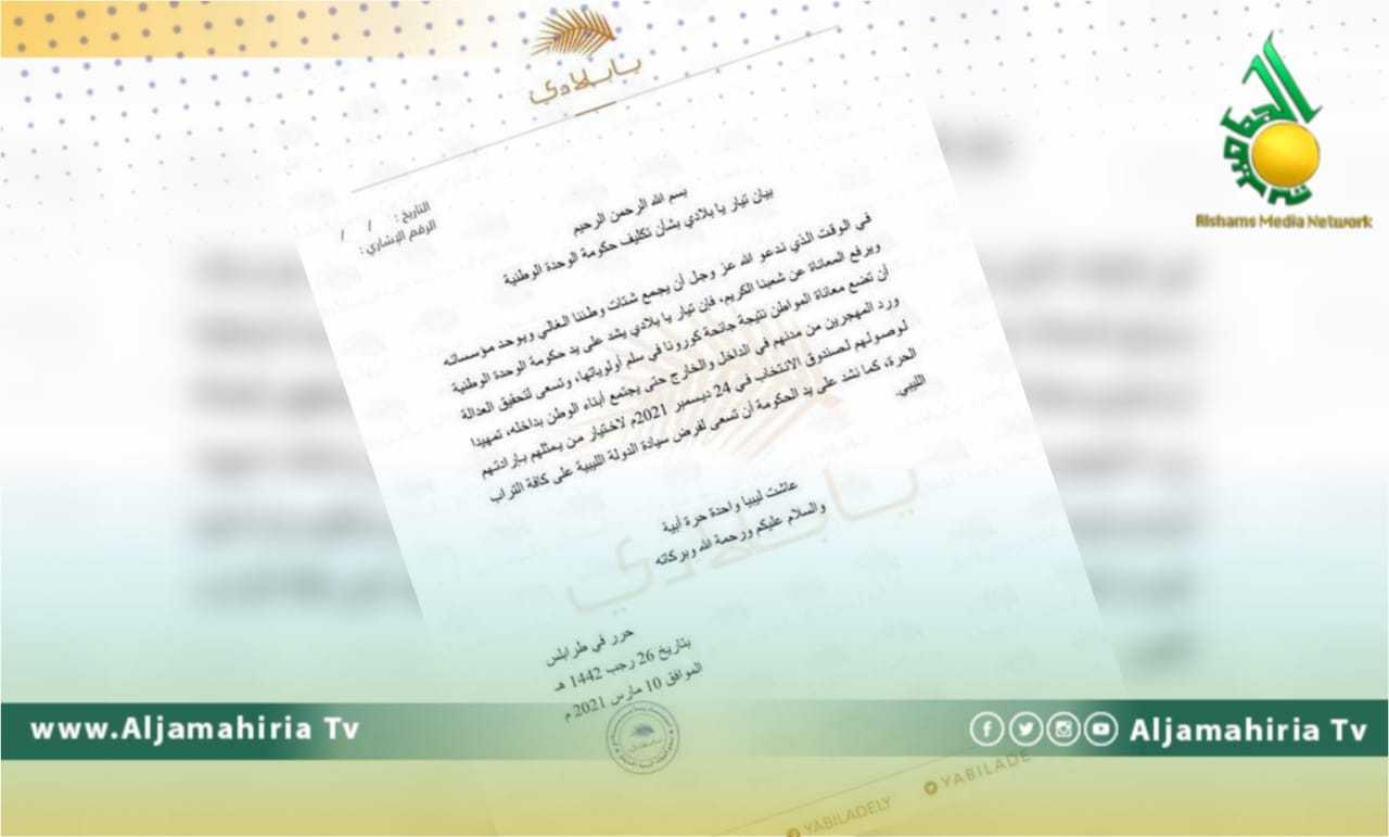 طالب تيار يا بلادي الحكومة الجديد أن تضع حدًا لمعاناة اللليبيين في سلم أولوياتها، والسعي لتحقيق العدالة ورد المهجرين تمهيدًا للوصول لصندوق الانتخابات في 24 الكانون/ديسمبر المُقبل، وأن تعمل على فرض سيادة الدولة على كافة التراب الليبي.