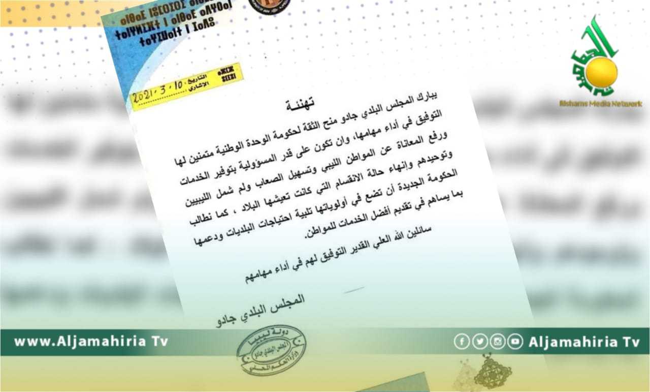 هنأ المجلس البلدي جادو، حكومة الدبيبة لحصولها على ثقة البرلما فيما عبر عن أمنياته أن تكون على قدر المسؤولية لرفع المعاناة عن المواطنين ولم شمل الليبيين وتوحيدهم وأن تضع في أولوياتها تلبية احتياجات البلديات ودعمها