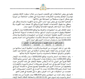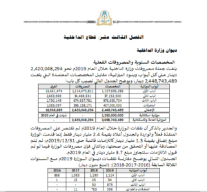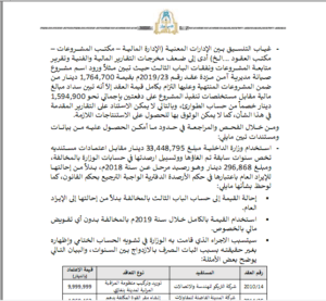 وبين التقرير، أنه تم إعطاء عقود بأكثر من 104 مليون دينار لشركتين بالتكليف المباشر في 37 معاملة، ولم يتبين مايفيد بتسلم السيارات فعليًا، إضافة إلى أن الوزارة كانت عشوائية في صرف الأموال ولم تفصل بين الحسابات وهناك تفاوت واضح بين إيراداتها الفعلية والمقدرة ، علاوة على أنها (الوزارة) لم تسوي نفقات السفر وعلاوة المبيت وتوسعت في “منح العُهد” دون تسويتها وتعزيزها المستندي ضعيف.