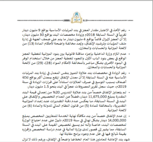 وأكد التقرير، أن الوزارة لم تعيد بواقي اعتمادات 2018 وصرفت على جهات، ذات ذمة مالية مستقلة بالمخالفة للقانون المالي للدولة منها مجلس النواب، كما أنها أفرطت في شراء السيارات بأسعار مرتفعة بالتكليف المباشر وتعاملت مع موردين محددين، وتعمدت نفس الطريقة في الشراء وأعمال الإنشاءات – ما معناه فساد صارخ لا أول له من آخر-