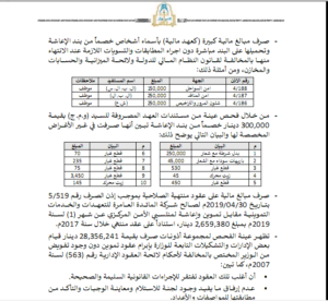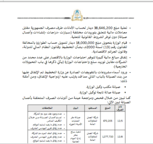 وأشار التقرير كذلك، إلى أن الوزارة صرفت مبالغ كبيرة كعهد مالية بأسماء أشخاص خصمًا من بند الإعاشة وتبين أن بعضها صرفت في غير هذا الغرض، كما أن عقود التموين والإعاشة تمت بالتكليف المباشر وبمبالغ ضخمة واستخدمت عقود وقرارات منتهية الصلاحية ولم تفعل لجنة العطاءات في منح العقود.