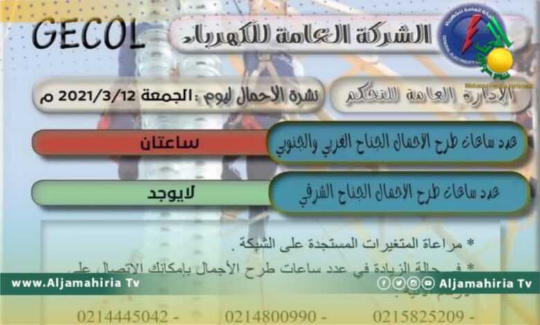 ودعت الشركة العامة للكهرباء عبر صفحتها بموقع “فيسبوك” إلى مراعاة المتغيرات المستجدة على الشبكة مؤكدة أنه في حال زيادة طرح الأحمال يمكن للمواطنين الاتصال بالشركة.
