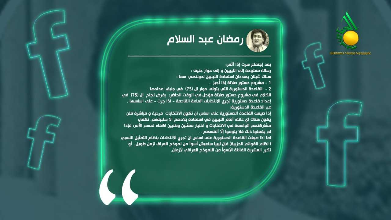 وجه الاستاذ رمضان عبد السلام، رسالة مفتوحة الى الليبيين حول الانتخابات المقبلة والترشح من خلالها ونظام القوائم، عبر صفحته على موقع التواصل الاجتماعي “فيس بوك” وإلى نص المنشور: