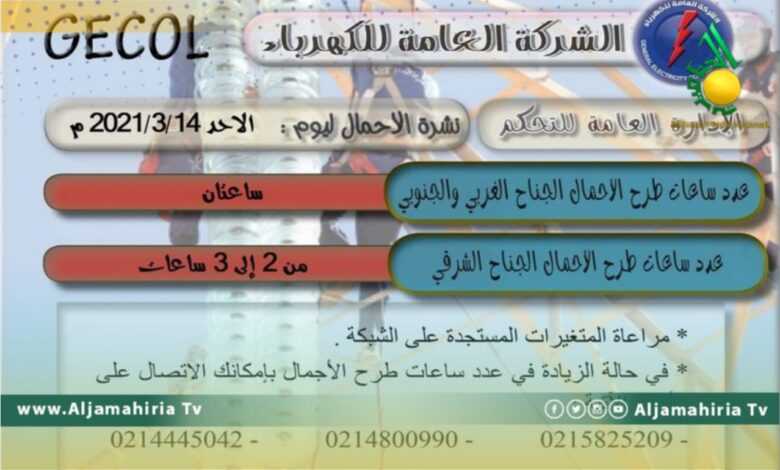 وقالت الشركة في بيان لها على صفحتها على موقع التواصل الاجتماعي، “فيس بوك” طالعته “الجماهيرية”، أن ساعات طرح الأحمال، في الجناح الشرقي، سيكون ما بين ساعتين وثلاثة.