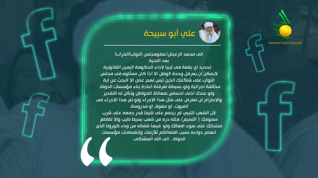 وقال أبو سبيحة في تدوينة له على صفحته على فيسبوك، موجها رسالته إلى محمد الرعيض عضو مجلس النواب الذي وصفه بـ (الخراب): بعد التحية..