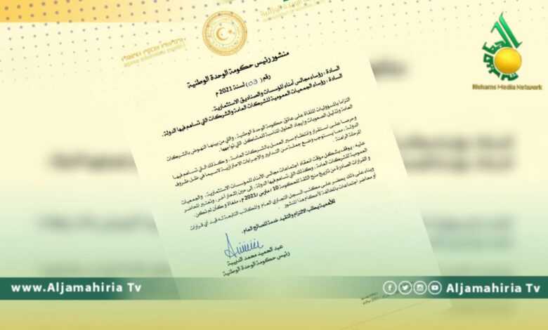 أوقف رئيس الحكومة الانتقالية عبد الحميد الدبيبة، في منشور له اجتماعات مجالس الأمناء للمؤسسات الاستثمارية والجمعيات العمومية للشركات العامة بشكل مؤقت.