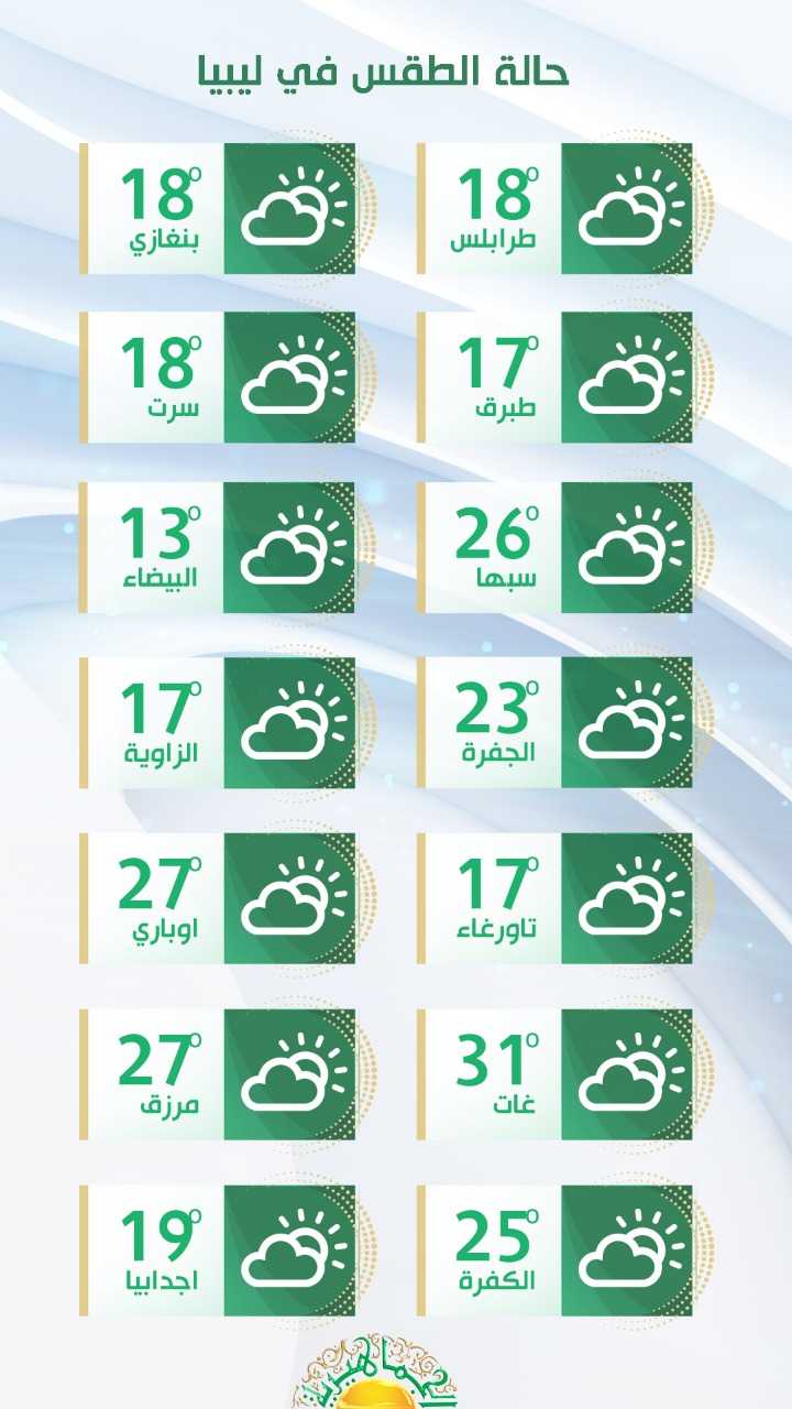 سقوط أمطار متفرقة اليوم على بعض المناطق الساحلية والجبل الأخضر، والرياح غربية إلى شمالية غربية، معتدلة إلى نشطة السرعة على بعض المناطق ودرجات الحرارة القصوى تتراوح بين 17 و23 درجة مئوية، ولا تتجاوز 14 درجة مئوية على الجبل الأخضر.