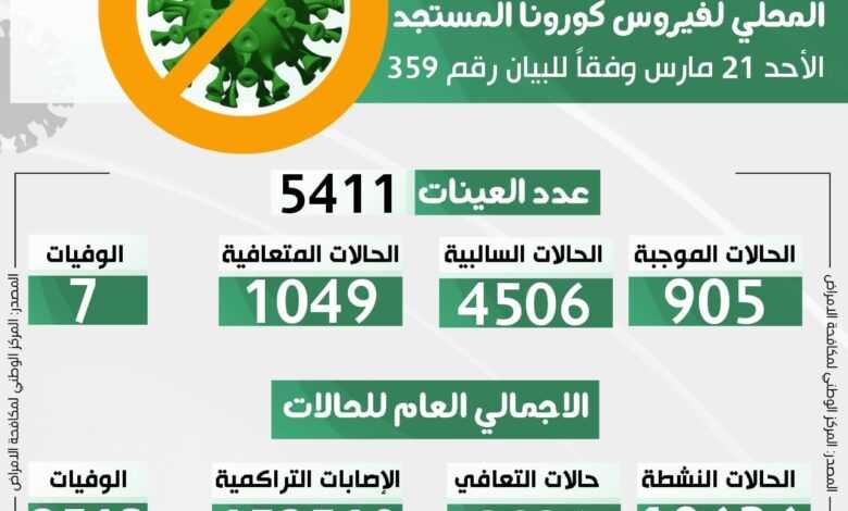– عدد (905) عينة موجبة ( 719 جديدة + 186 مخالطة )