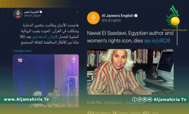 في الـ ٢١ من مارس الجاري، وبعد ساعاتٍ من الإعلان عن وفاة الدكتورة نوال السعداوي، سارعت قناة الجزيرة في قطر والناطقة باللغة العربية، لجمع بعض الآراء الجدلية للمفكرة الراحلة، ثم وضعت عنوانًا لها “هاجمت الأديان وطالبت بتقنين الدعارة وشككت في القرآن. الموت يُغيب الروائية المثيرة للجدل بعد ٩٠ عامًا من الأقكار المناقضة لثقافة المجتمع” هكذا وبهذا الخطاب شيعت الجزيرة نوال السعداوي للجمهور العربي.