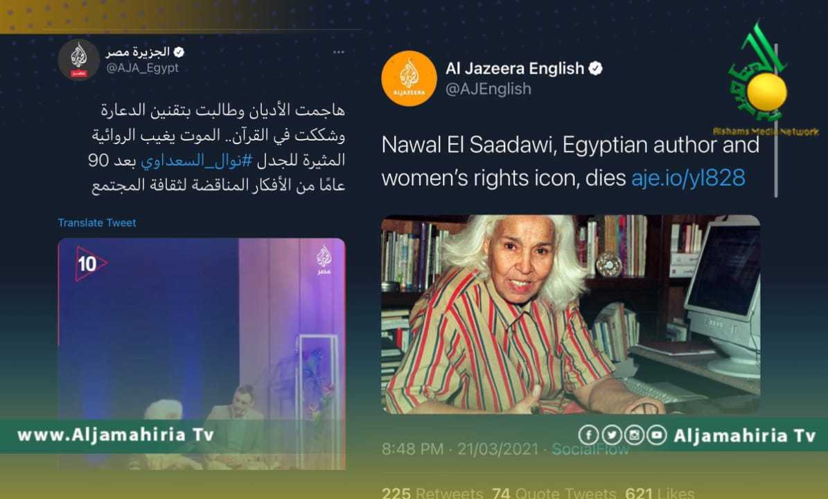 لكن التناقض الذي يظهرُ بوضوح في خطاب الجزيرة بالإنجليزية في نفس الوقت، كانت الجزيرة الناطقة بالإنجليزية تنعي رحيل الدكتورة تحت عنوان “رحيل أيقونة حقوق الإنسان نوال السعدواي”.