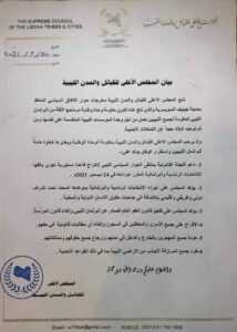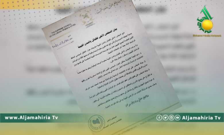 المجلس الاعلى للقبائل والمدن الليبية يطالب في بيان له بالإفراج على جميع الاسرى والمعتقلين وطرد جميع المرتزقة الاجانب
