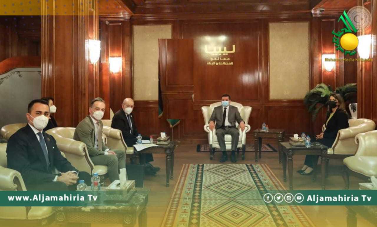 جاء ذلك خلال لقاء كل من وزير الخارجية الفرنسي جان إيف لودريان، ووزير الخارجية الألماني هايكو ماس ، ووزير الخارجية الإيطالي لويجي دي مايو، برئيس حكومة الوحدة الانتقالية «عبد الحميد دبيبة»، ظهر اليوم الخميس، بمقر ديوان مجلس الوزراء بالعاصمة طرابلس.