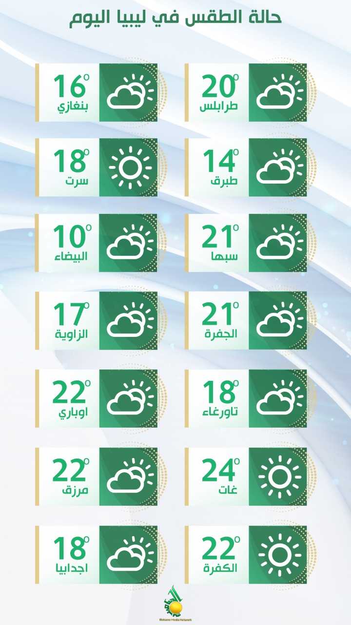وأفاد الأرصاد أن حالة الطقس المتوقعة في رأس أجدير، سرت، سهل الجفارة وحتى جبل نفوسة، ستكون مشمس إلى قليل الغيوم على الساحل، والرياح متغيرة الاتجاه إلى شمالية غربية خفيفة إلى معتدلة السرعة.