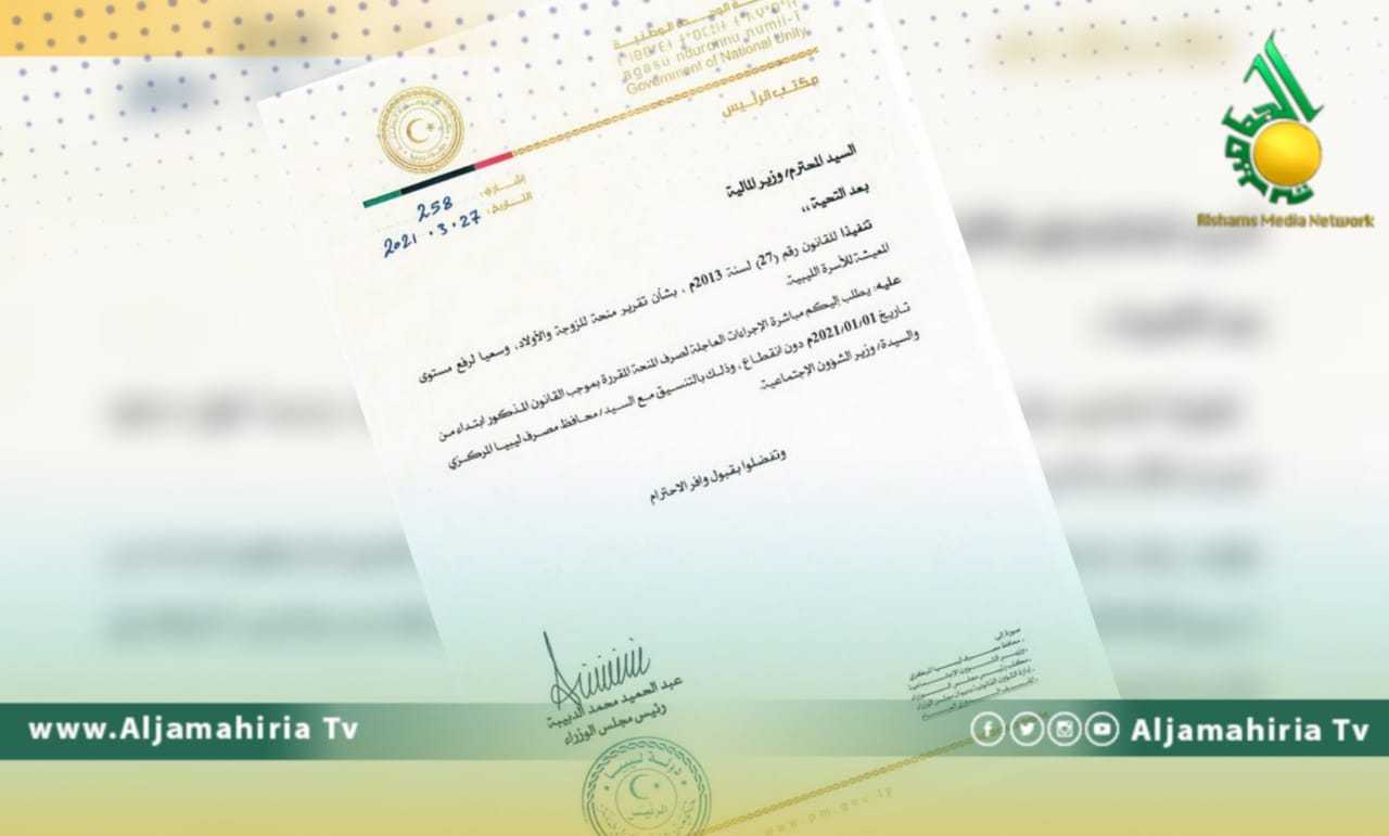 جاء ذلك في خطابه الموجه لوزير المالية الذي اشار فيه للقانون ( 27 ) لسنة 2013 بشلن تقرير منحة للزوجة والأولاد ، وسعيا لرفع مستوى المعيشة للآسر الليبية