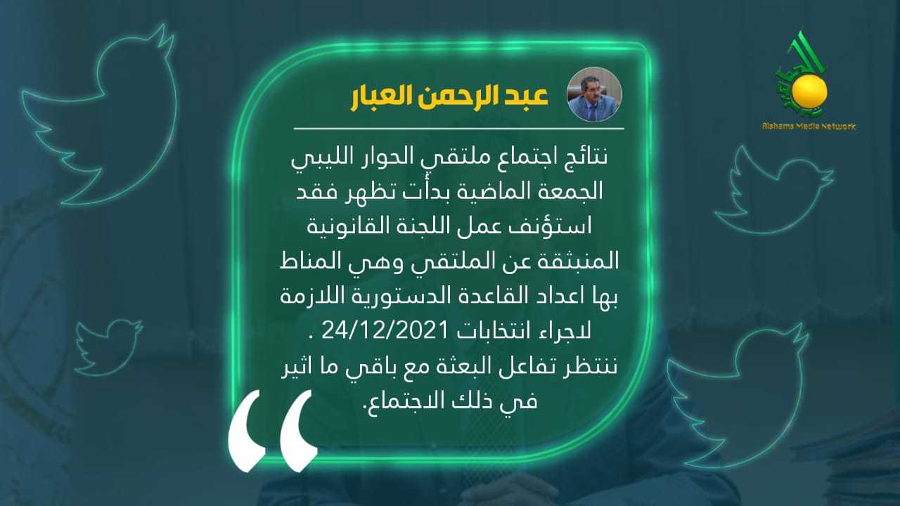 وأوضح العبار، أنه تم استئناف عمل اللجنة القانونية المنبثقة عن الملتقي وهي المناط بها اعداد القاعدة الدستورية اللازمة لاجراء انتخابات 24/12/2021 .