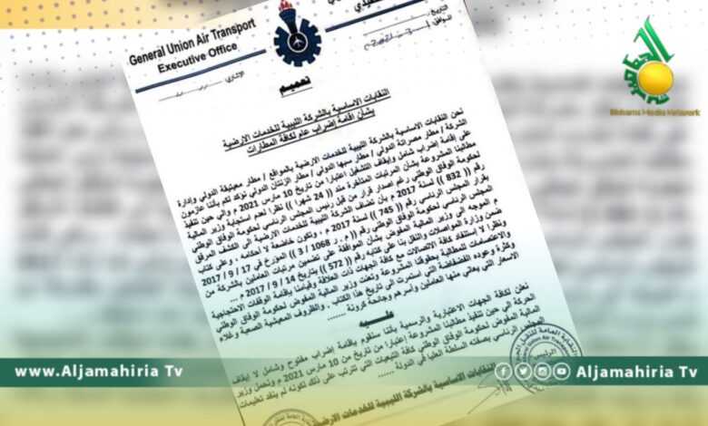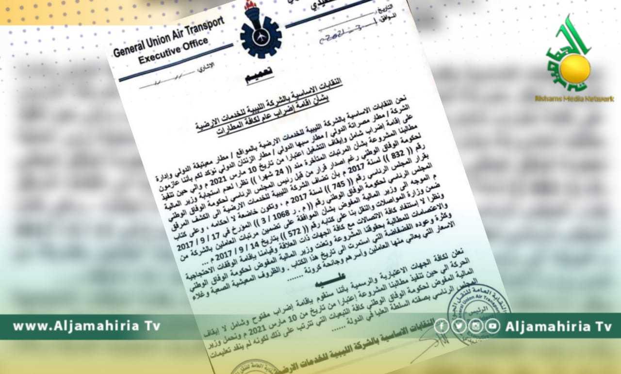 قررت نقابة شركة الخدمات الأرضية بمطارات معيتيقة وسبها، والزنتان ومصراتة الاضراب ووقف التشغيل بدايةً من 10 الربيع /مارس الجاري.