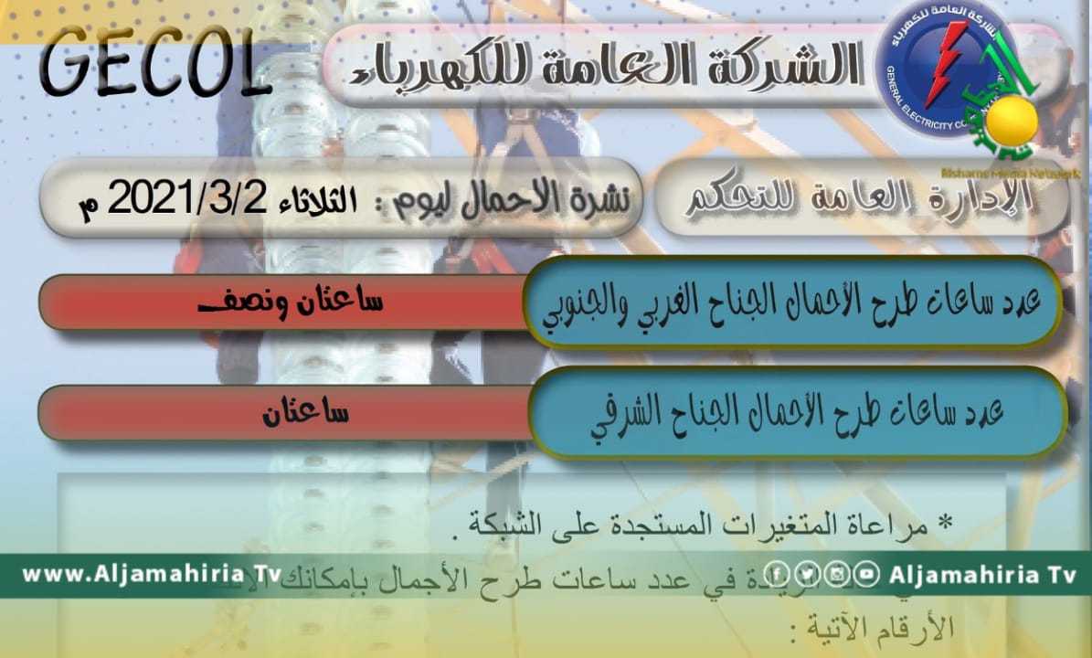 تتراوح عدد ساعات طرح الأحمال اليوم الثلاثاء ما بين ساعتين ونصف وثلاث ساعات في مختلف المناطق في ليبيا.