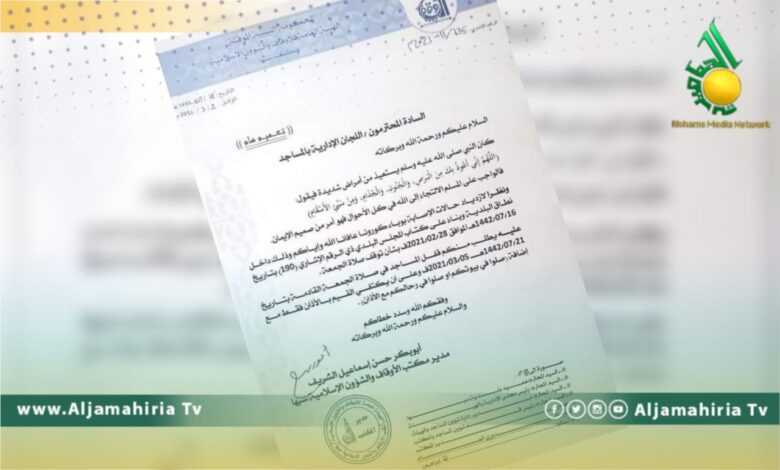 طلب مكتب الهيئة العامة للأوقاف والشؤون الإسلامية، في مدينة “سبها”، من اللجان الإدارية بالمساجد قفل المساجد في صلاة الجمعة المقبلة داخل نطاق البلدية.