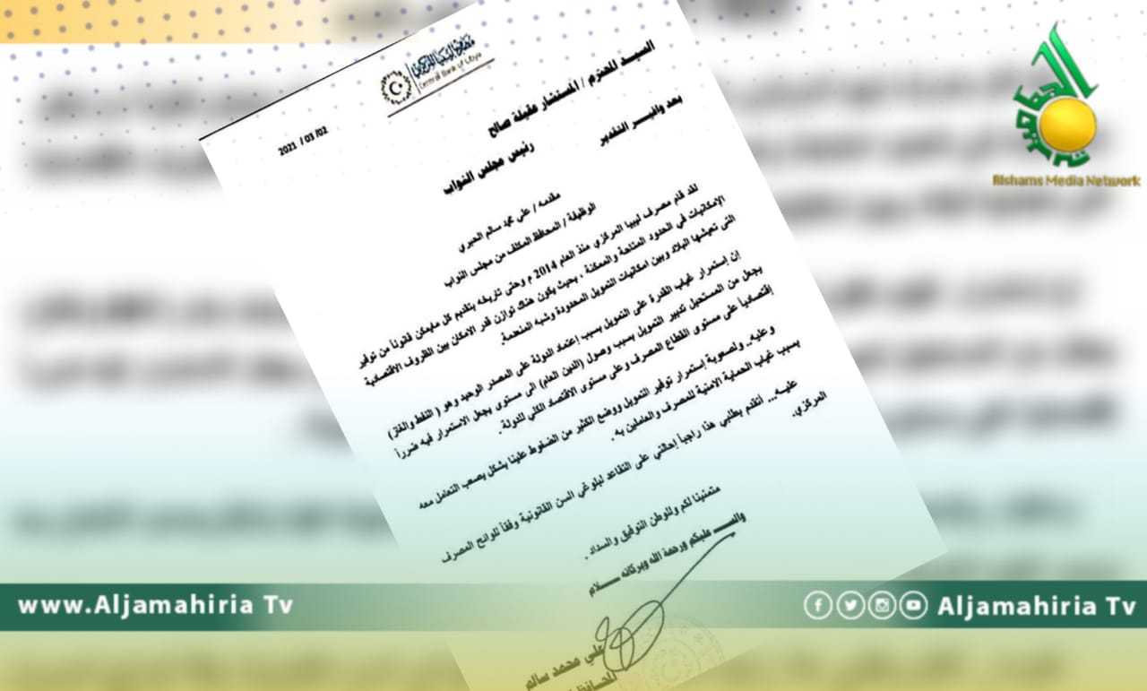 تقدم محافظ مصرف ليبيا المركزي بالشرق، على الحبري، بطلب لرئيس مجلس نواب طبرق، عقيلة صالح، اليوم الثلاثاء، لإحالته إلى التقاعد لبلوغه السن القانونية.