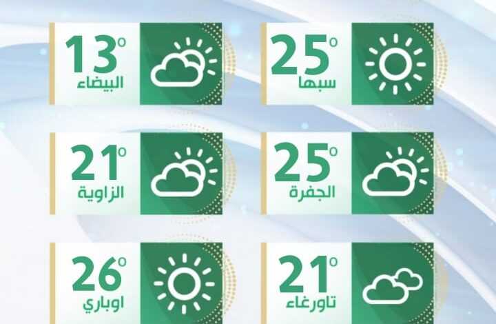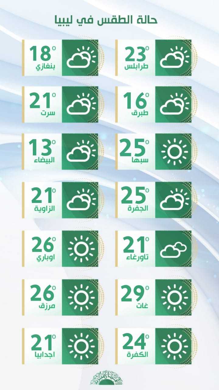 الطقس قليل الغيوم إلى صافي، والرياح شمالية إلى شمالية شرقية، معتدلة إلى نشطة السرعة على الساحل، ودرجات الحرارة القصوى تتراوح بين 15 و21 درجة مئوية، ولا تتجاوز 12 درجة مئوية على الجبل الأخضر.