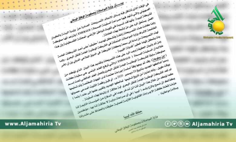 وزارة المواصلات تنفي الاتهامات الصهيونية بتلويث سفينة مملوكة لليبيا شواطئ المتوسط
