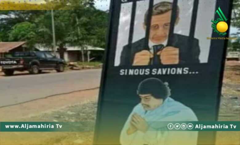 لوحة انتصبت في احد ابرز الشوارع في احدى الدول الافريقية جسدت صورة للقائد الشهيد معمر القذافي خاشعا وهو يؤدي صلاته وفي الخلفية يظهر الرئيس الفرنسي السابق نيكولا ساركوزي خلف القضبان ذليلا.
