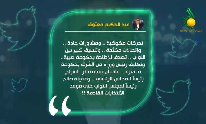 وقال معتوق في تغريدة له : تحركات مكوكية .. ومشاورات جادة .. وإتصالات مكثفة .. وتنسيق كبير بين النواب .. تهدف للإطاحة بحكومة دبيبة.. وتكليف رئيس وزراء من الشرق بحكومة مصغرة .. على أن يبقى فائز السراج رئيسآ للمجلس الرئاسي .. وعقيلة صالح رئيسآ لمجلس النواب حتى موعد الأنتخابات القادمة !!